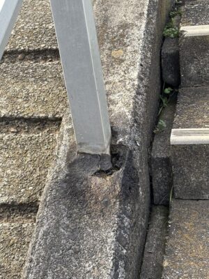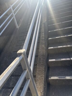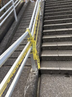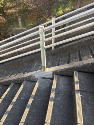 昨年の年末に、飯山満南公園付近の階段の手すりが、キケンのテープが貼られてから、1年近くたってもそのままのため、階段を利用する方から、「どうなっているのか。飯山満南公園で、太極拳を行っているので、高齢者の方がこの階段を利用するので、キケンのままでいいのか」と、相談がありました。