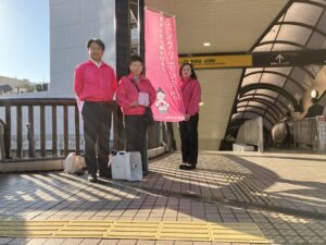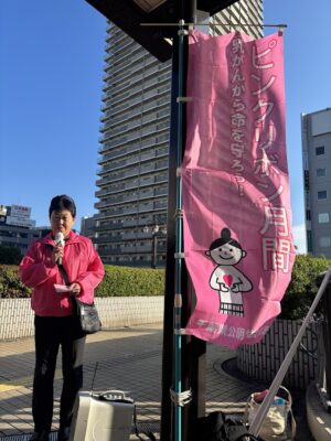 毎週木曜日、朝の駅頭(7時~8時)を行っていますが、今朝は、仲村ひであき県議・草場ともみ市議と共に、「ピンクリボン街頭」を行いました。